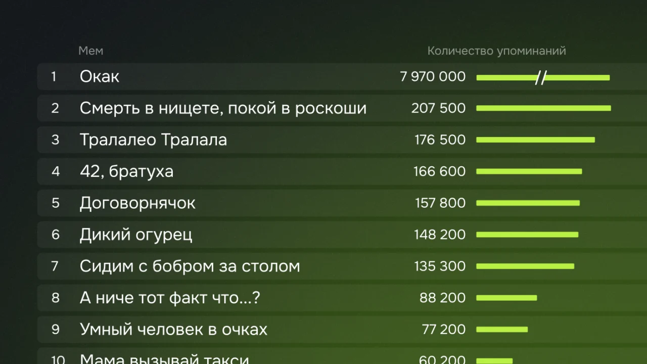 Абсолютным и безоговорочным мем-королём года стал мем «Окак» — с ошеломляющими 7,97 млн упоминаний. Его популярность, превосходящая показатели остальных мемов на порядок, сигнализирует о доминировании нового типа коммуникации: абсурдного, ироничного и мгновенно узнаваемого сленга, который стал универсальной реакцией на любую ситуацию.