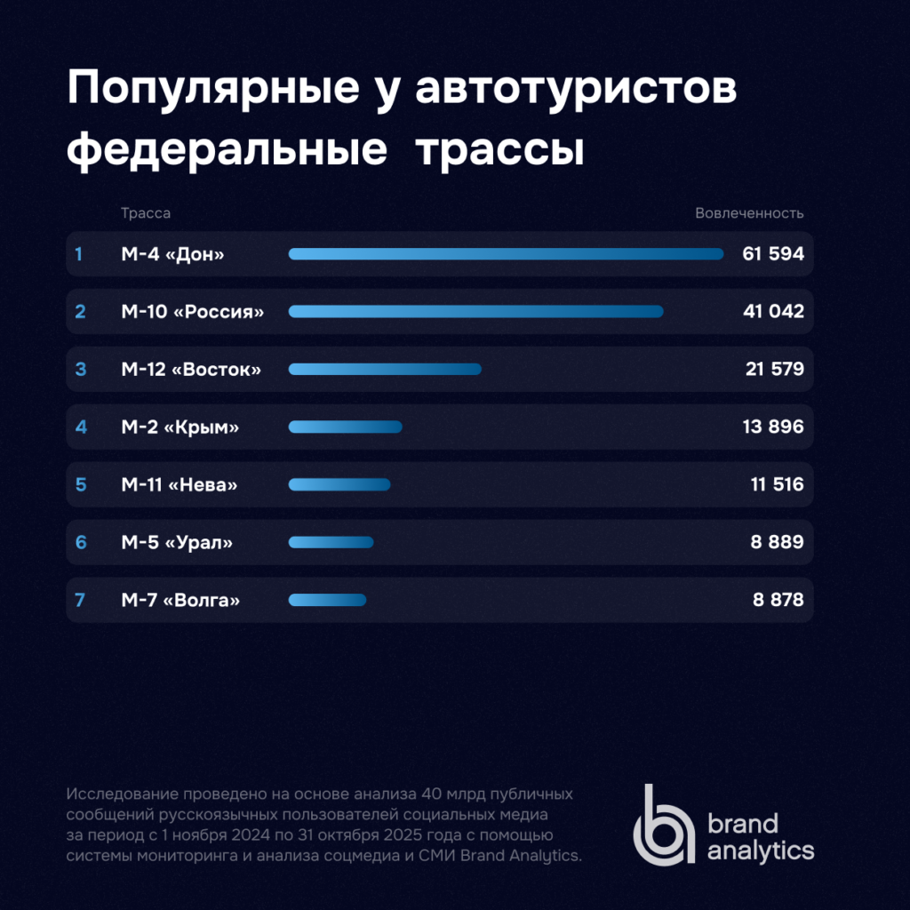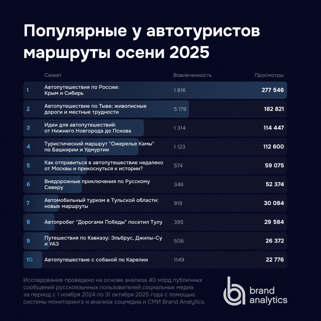 Исследование проведено на основе анализа 40 млрд публичных сообщений русскоязычных пользователей социальных медиа за период с 1 ноября 2024 по 31 октября 2025 года с помощью системы мониторинга и анализа соцмедиа и СМИ Brand Analytics. По теме автопутешествий было выявлено и проанализировано 312 тысяч сообщений.