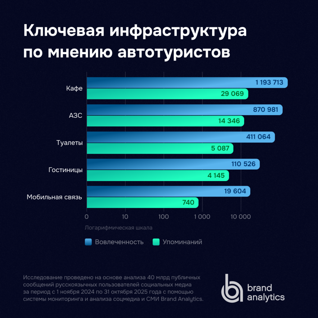 Дорога перестала быть способом перемещения между точками А и Б. Современная дорожная инфраструктура стала полноценной частью туристического опыта. Для автотуристов наличие комфортных мест отдыха, заправок, туалетов, точек питания и мобильной связи напрямую влияет на впечатления от поездки и принятие решения о следующей. Больше всего внимания пользователей соцмедиа волнуют точки питания, заправки и туалеты на маршруте. Чуть менее популярно, но также в топе обсуждения, наличие на пути следования гостиниц и мобильной связи.