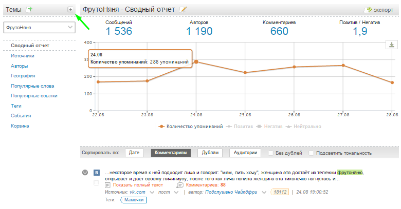 Во-вторых, интерфейс системы пополнился новой фишкой. В меню Темы в левой верхней части экрана появилась кнопка со значком «минус», которая сворачивает список тем в единое окно. Новый формат отображения данных придется по вкусу минималистам – в нем акцент делается на исследуемой в конкретный момент теме мониторинга. В меню слева остаются все отчеты по активной теме: Сводный отчет, Источники, Авторы, География, Популярные слова и ссылки, Теги, События и Корзина.