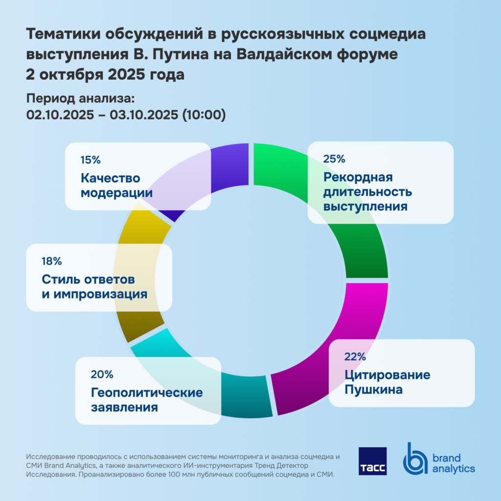 Выступление Президента России Владимира акПутина на Валдайском форуме 2 октября 2025 года вызвало значительный резонанс в русскоязычном сегменте социальных медиа. Пользователи особо отметили продолжительность выступления президента (25% публикаций), цитирование Пушкина (22%), геополитические заявления о России, Европе и США (20%), стиль ответов и импровизацию со стороны российского президента (18%) и качество модерации (15%).