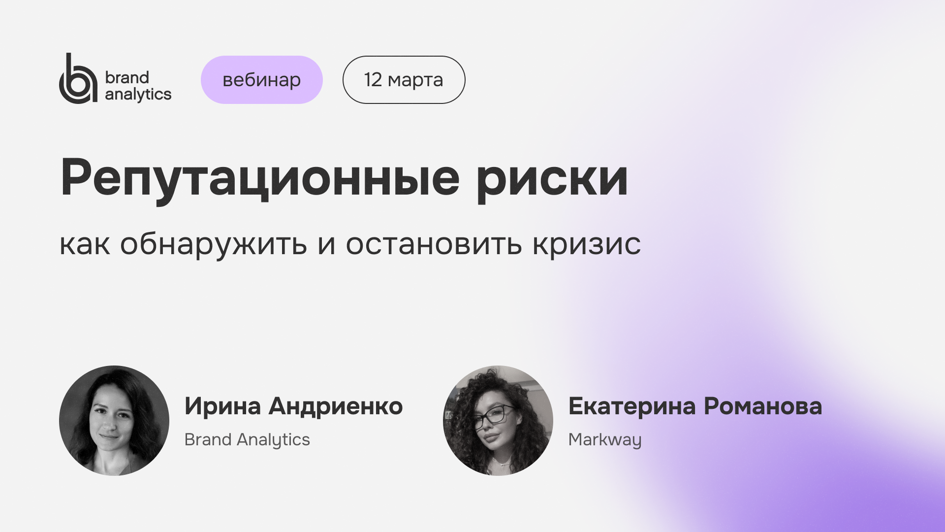 На бесплатном вебинаре 12 марта в 11:00 эксперты из Markway и Brand Analytics поделятся практическим опытом управления репутацией и антикризисного реагирования в цифровой среде.