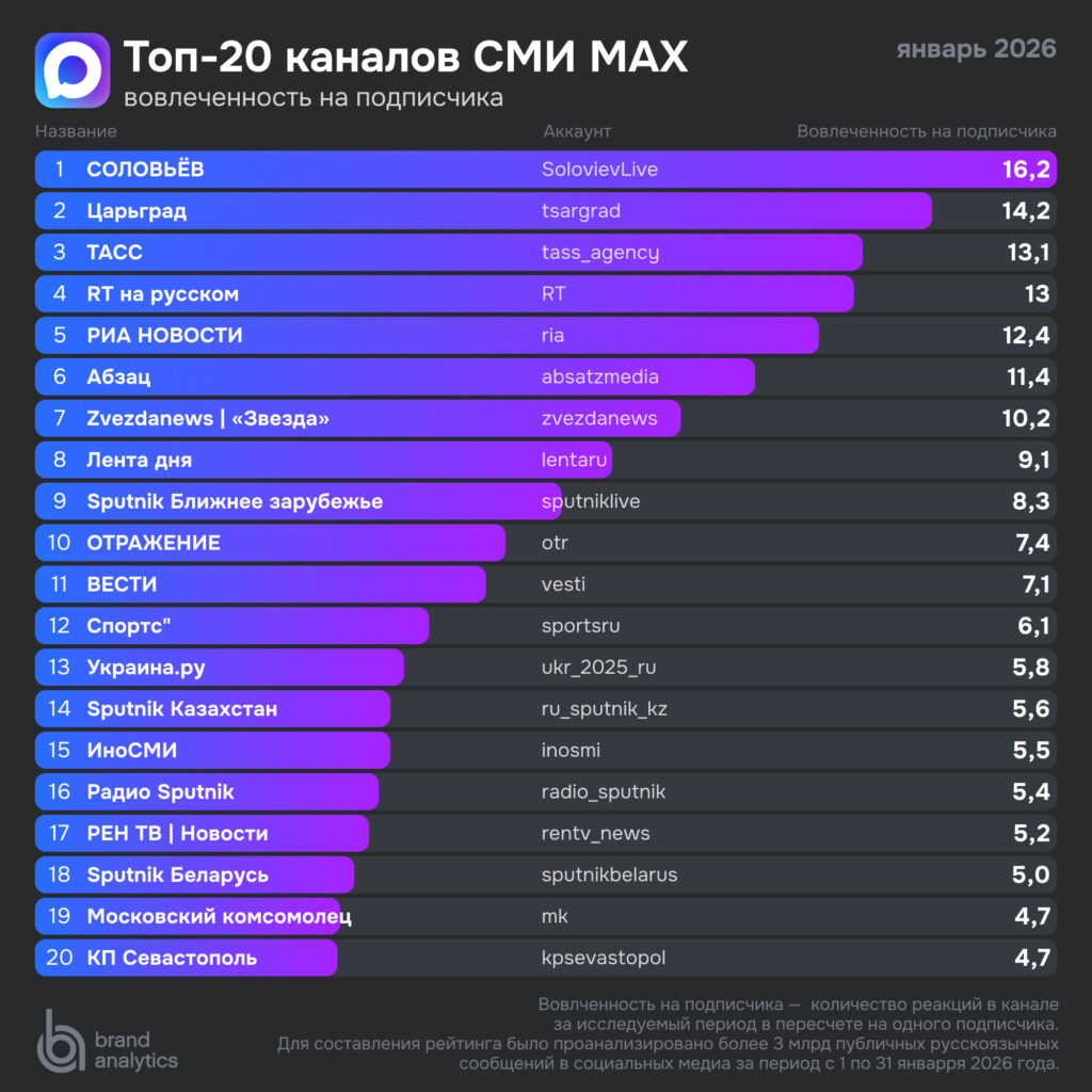 Анализировались официальные каналы СМИ в мессенджере MAX за январь 2026 года. Вовлеченность на пост — это среднее количество реакций под одной публикацией. Вовлеченность на подписчика — общее число реакций, поделенное на количество подписчиков канала.
