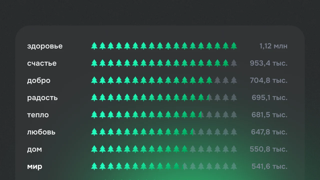 - «Тепло» (681,5 тыс.) — ключевое слово в поздравлениях пользователей. Оно обогнало даже «любовь» и «дом», выступая универсальной метафорой душевного комфорта, безопасности и уюта в отношениях.