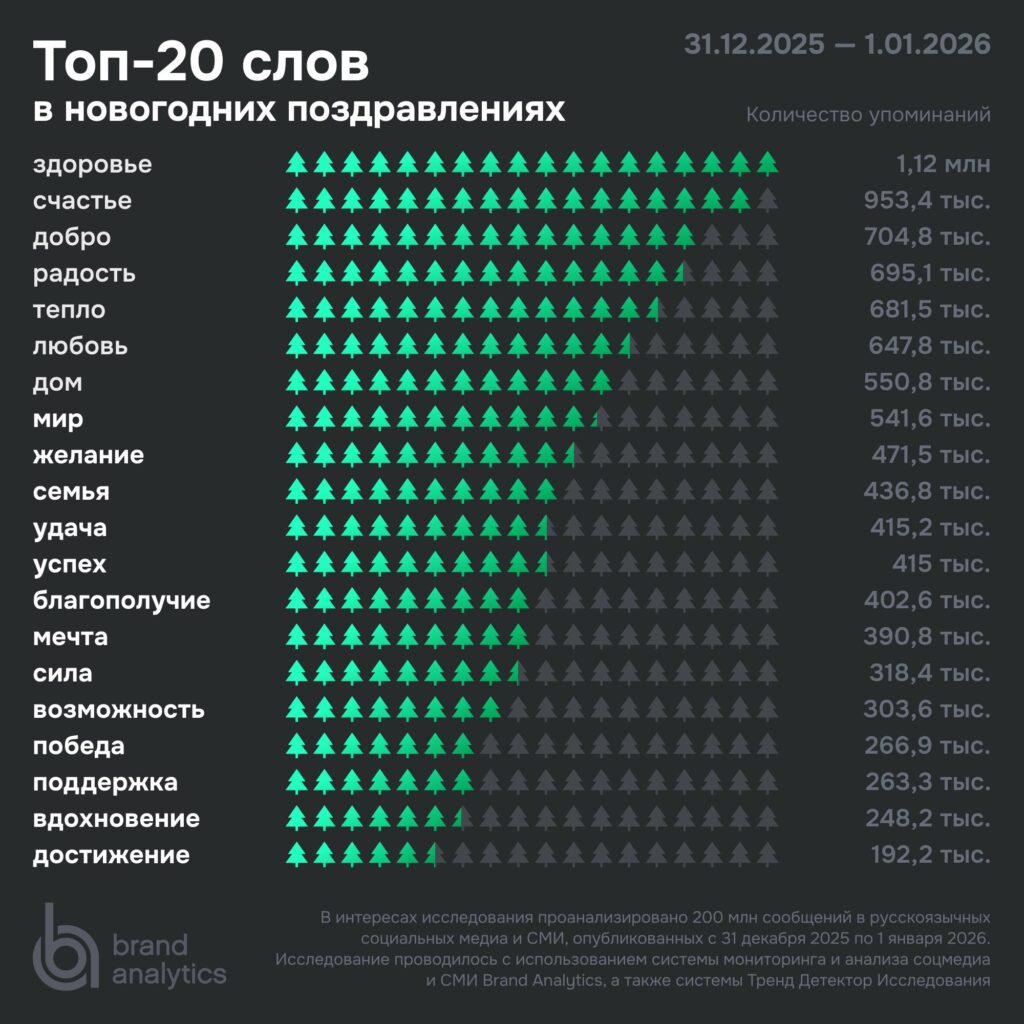 Для выявления наиболее часто использовавшихся слов в новогодних поздравлениях было проанализировано более 200 млн сообщений в русскоязычных социальных медиа, опубликованных 31 декабря 2025 года и 1 января 2026 года. На основе этого массива составлен топ-20 самых частотных слов в новогодних поздравлениях. Исследование проводилось с использованием системы мониторинга и анализа соцмедиа и СМИ Brand Analytics, а также системы Тренд Детектор Исследования.