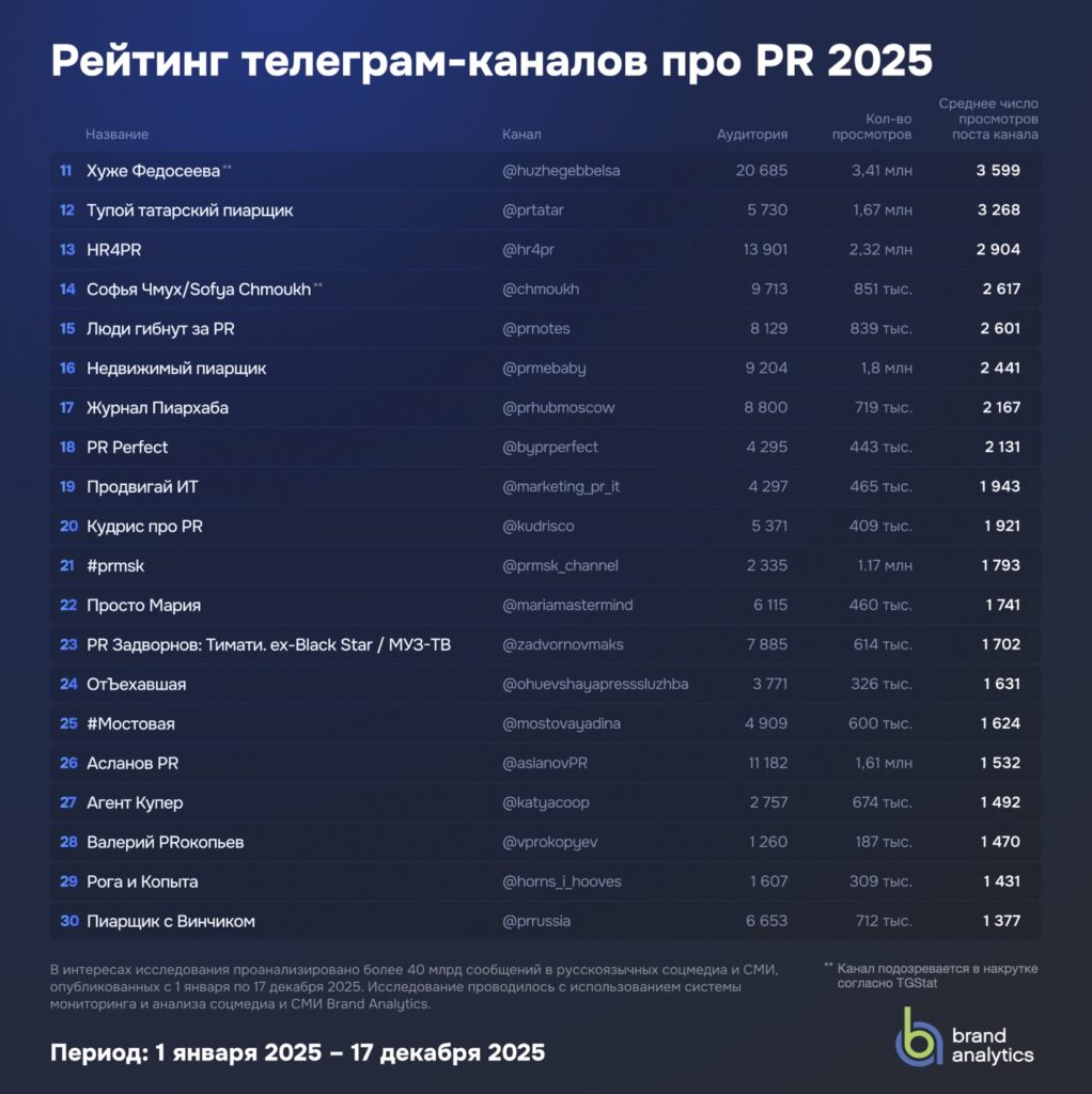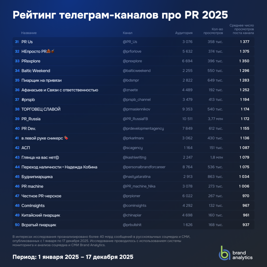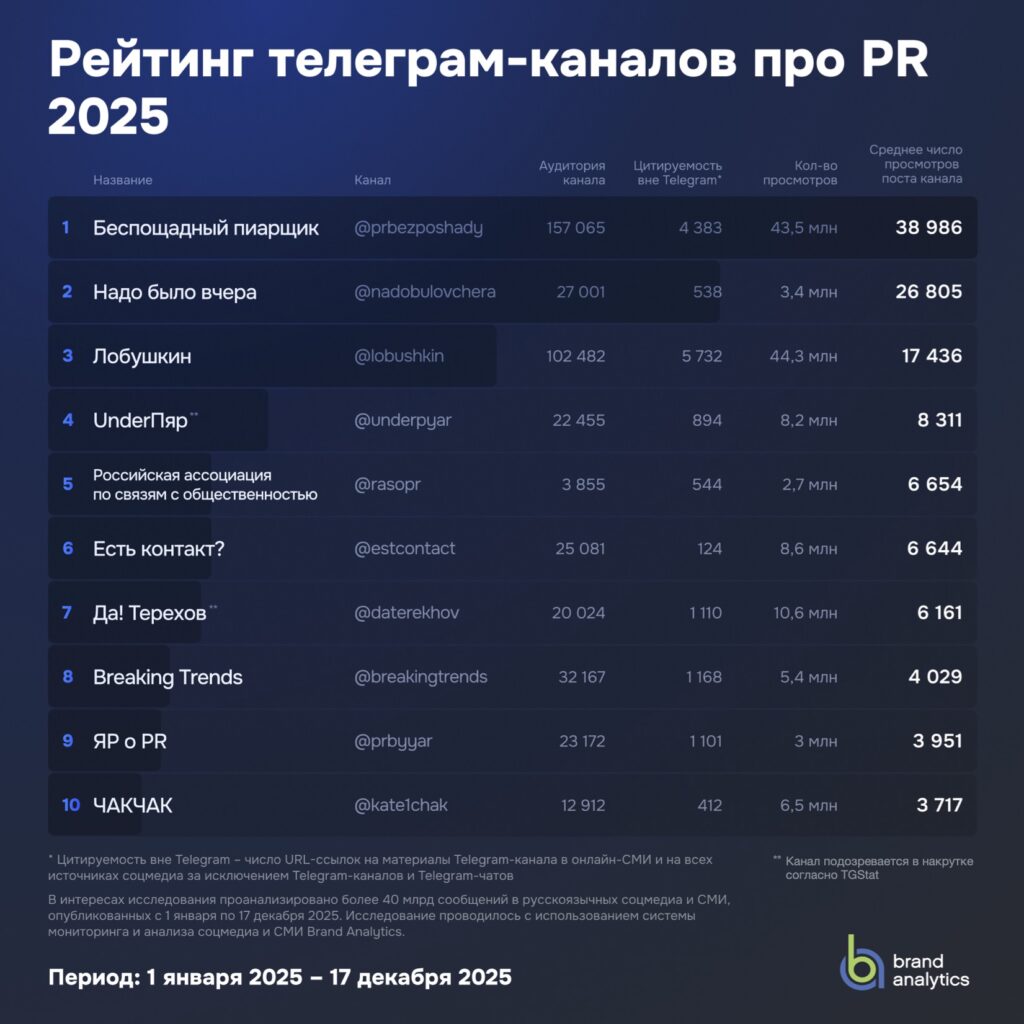 Brand Analytics представляет итоговый рейтинг русскоязычных Telegram-каналов, посвященных пиару, за 2025 год. Исследование охватывает период с 1 января по 17 декабря 2025 года и выявляет главных лидеров мнений в профессиональном поле на основе анализа реальной вовлеченности аудитории.