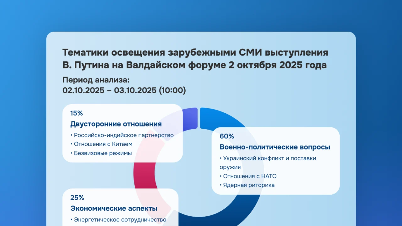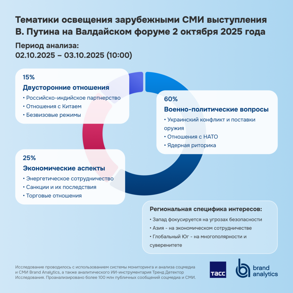 Анализ освещения выступления президента России Владимира Путина на XXII ежегодном заседании Международного дискуссионного клуба «Валдай» в зарубежных СМИ выявил значительные региональные различия в подходах, тональности и акцентах освещения. Исследование охватило более 800 публикаций из западных, азиатских СМИ, а также изданий Ближнего Востока, Африки и Латинской Америки, опубликованных со 2 по 3 октября 2025 г.