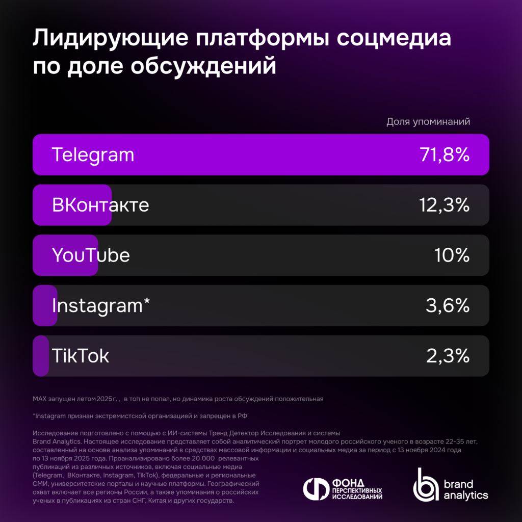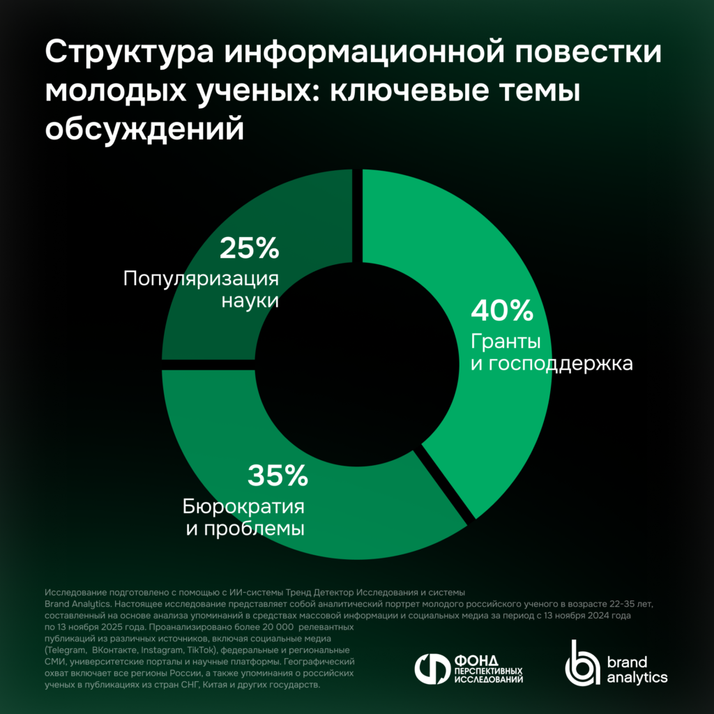 Исследование проводилось с использованием ИИ-системы «Тренд Детектор Исследования», для чего были проанализированы 40 млрд публичных сообщений в СМИ и соцмедиа за период с 13 ноября 2024 года по 13 ноября 2025 года. Из них по теме молодых ученых выявлено более 20 000 публикаций из различных источников, включая социальные сети (Telegram, ВКонтакте, TikTok , Instagram*( соцсеть признана экстремистской и запрещена в РФ), федеральные и региональные СМИ, университетские порталы и научные платформы. Географический охват включает все регионы России, а также упоминания о российских ученых в публикациях из стран СНГ, Китая и других государств.