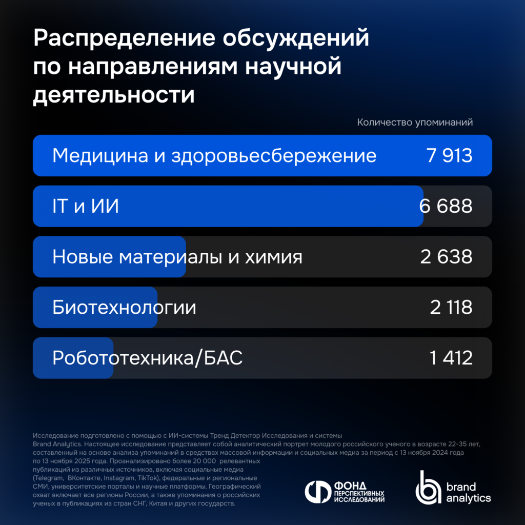 Анализ соцмедиа показывает: современный молодой ученый – это специалист 22-35 лет, работающий в приоритетных областях: медицина и здоровьесберегающие технологии, искусственный интеллект, новые материалы и биотехнологии, робототехника и беспилотные авиационные системы. Географически научная активность концентрируется в крупных исследовательских центрах: Москве, Санкт-Петербурге, Республике Татарстан, Новосибирской и Томской областях.